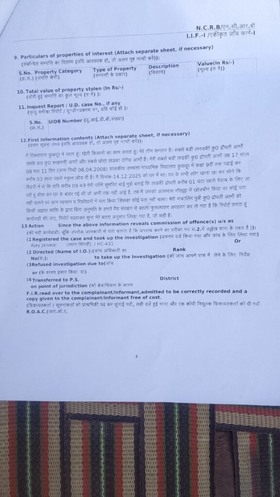 सबसे बड़ी पुत्री कु. द्रोपती आर्मी (उम्र 17 वर्ष 08 माह 11 दिन, जन्म तिथि 06 अप्रैल 2008) पूर्व में शासकीय उच्चतर माध्यमिक विद्यालय कुकदूर में कक्षा 9वीं तक अध्ययनरत थी, जिसे वह लगभग तीन वर्ष पूर्व छोड़ चुकी थी।प्रार्थी ने पुलिस को बताया कि दिनांक 14 दिसंबर 2025 को रात्रि करीब 9 बजे उसकी पुत्री द्रोपती यह कहकर घर से बाहर निकली कि वह पेशाब के लिए जा रही है, लेकिन लगभग एक घंटे बाद भी वापस नहीं लौटी।