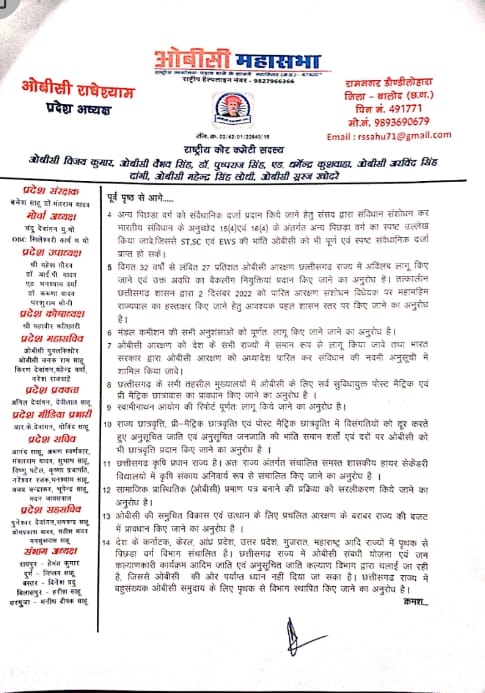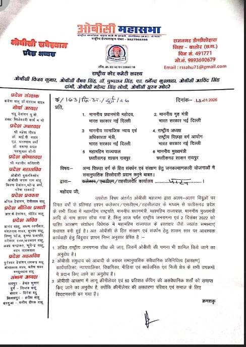इसके साथ ही छत्तीसगढ़ राज्य में लंबे समय से लंबित 27 प्रतिशत ओबीसी आरक्षण को शीघ्र लागू करने की प्रमुख मांग भी रखी गई।ओबीसी महासभा प्रदेश अध्यक्ष राधेश्याम साहू के निर्देशानुसार सौंपे गए इस ज्ञापन में कुल 28 बिंदुओं के माध्यम से ओबीसी समाज से जुड़े विभिन्न मुद्दों को प्रमुखता से उठाया गया। यह ज्ञापन माननीय प्रधानमंत्री जी, माननीय गृह मंत्री भारत सरकार, माननीय मुख्यमंत्री छत्तीसगढ़ शासन एवं महामहिम राज्यपाल छत्तीसगढ़ के नाम संबोधित किया गया।