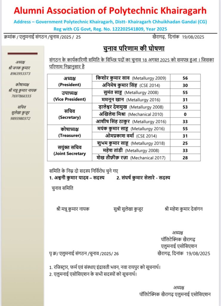 खैरागढ़, 20 अगस्त 2025 शासकीय पॉलिटेक्निक खैरागढ़ की Alumni Association Election 2025 इस बार इतिहास रच गई।