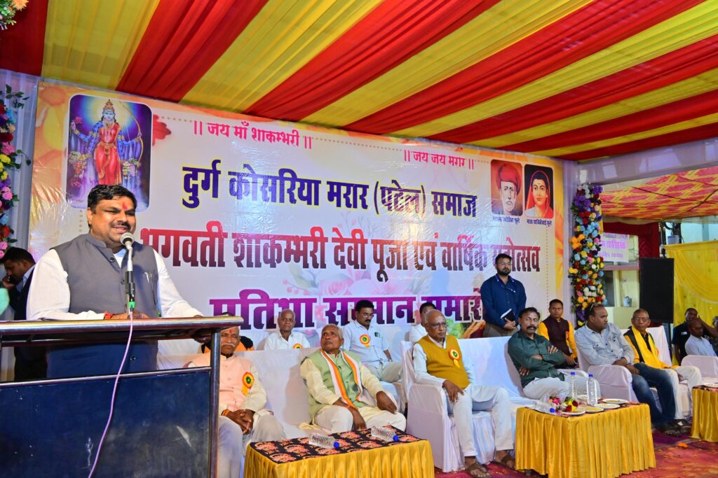 दुर्ग। रविवार को दुर्ग विधानसभा क्षेत्र में आयोजित विभिन्न धार्मिक एवं सामाजिक आयोजनों में कैबिनेट मंत्री गजेन्द्र यादव शामिल हुए। इन आयोजनों के माध्यम से उन्होंने समाजजनों से संवाद किये और समाज की एकता, सहयोग और सेवा भाव को निरंतर आगे बढ़ाने का संदेश दिया। कार्यक्रम में सामाजिक विकास से जुड़ी मांगों को पूर्ण करने की घोषणाएँ भी किये। यादव समाज के युवक युवतियों के परिचय सम्मलेन में स्वास्थ्य शिविर और जरुरतमंद मरीजों की सेवा करने ब्लड डोनेशन की सराहना कर पुनीत कार्य में सहभागी बने युवाओं का उत्साहवर्धन किये।