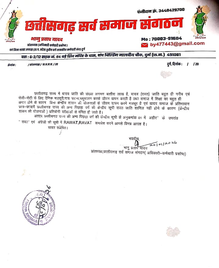 ज्ञापन में उल्लेख है कि छत्तीसगढ़ राजपत्र क्रमांक-293, दिनांक 27/06/2020 के तहत राज्य सूची में यादव एवं उसकी उपजाति रावत को शामिल किया जा चुका है। बावजूद इसके, राष्ट्रीय पिछड़ा वर्ग आयोग (केंद्रीय सूची) में रावत जाति दर्ज नहीं होने से यादव समाज की यह उपजाति सामान्य वर्ग में आ रही है, जिसके कारण उन्हें केन्द्रीय शासन की योजनाओं और प्रतियोगी परीक्षाओं के लाभ से वंचित होना पड़ रहा है।ज्ञापन में यह भी बताया गया कि छत्तीसगढ़ शासन के मंत्रालय महानदी भवन, नवा रायपुर का पत्र क्रमांक 2474/1909/2015/25-2 (दिनांक 14/08/2025) तथा छत्तीसगढ़ राज्य पिछड़ा वर्ग आयोग का पत्र क्रमांक 453/बैठक/पिवआ/2025 (दिनांक 10/06/2025) द्वारा अनुशंसा किए जाने के बावजूद अब तक केन्द्रीय सूची में रावत जाति का समावेश नहीं हुआ है।