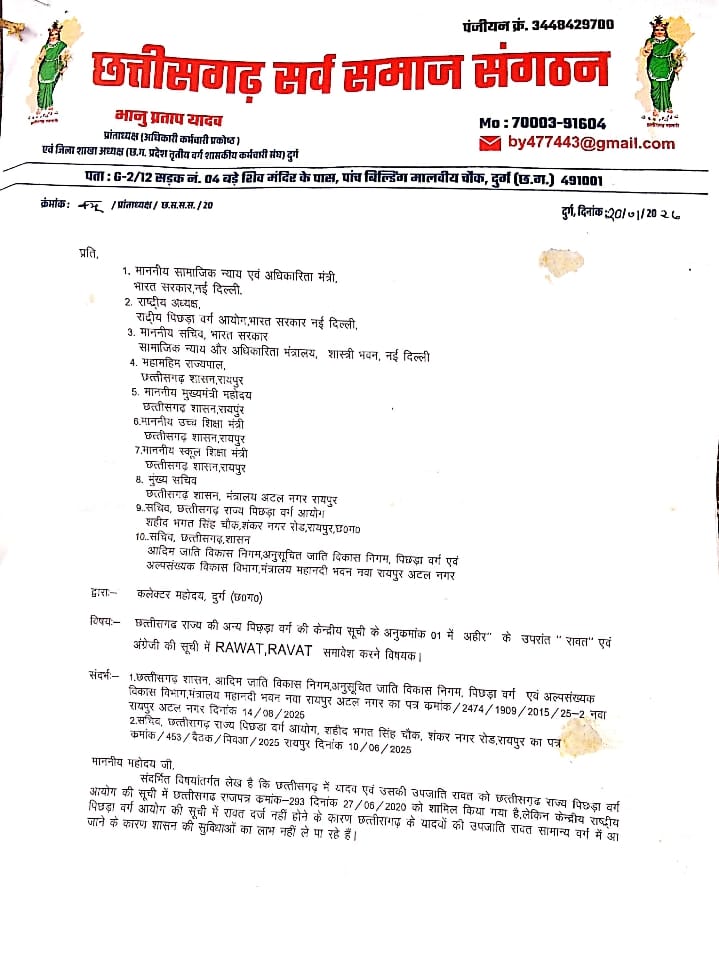 दुर्ग। छत्तीसगढ़ राज्य की यादव समाज की उपजाति रावत को अन्य पिछड़ा वर्ग (ओबीसी) की केन्द्रीय सूची में शामिल कराने की मांग को लेकर आंदोलन तेज हो गया है। इस संबंध में छत्तीसगढ़ सर्व समाज संगठन (अधिकारी-कर्मचारी प्रकोष्ठ) के प्रांताध्यक्ष भानु प्रताप यादव एवं छ.ग. प्रदेश तृतीय वर्ग शासकीय कर्मचारी संघ, दुर्ग के जिलाध्यक्ष द्वारा कलेक्टर दुर्ग के माध्यम से माननीय मुख्यमंत्री, मुख्य सचिव, छत्तीसगढ़ राज्य पिछड़ा वर्ग आयोग सहित केंद्र व राज्य के शीर्ष पदाधिकारियों को ज्ञापन सौंपा गया है।