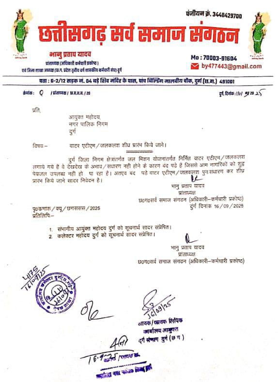 दुर्ग, 16 सितंबर 2025।छत्तीसगढ़ सर्व समाज संगठन (अधिकारी-कर्मचारी प्रकोष्ठ) के प्रांताध्यक्ष भानु प्रताप यादव ने नगर पालिक निगम दुर्ग के आयुक्त महोदय को ज्ञापन प्रेषित कर दुर्ग नगर निगम क्षेत्र में जल मिशन योजना के तहत स्थापित वाटर एटीएम और जलकलश शीघ्र संधारण कर पुनः चालू करने की मांग की है।ज्ञापन में उल्लेख किया गया है कि देखरेख और आवश्यक मरम्मत के अभाव में कई स्थानों पर वाटर एटीएम एवं जलकलश बंद पड़े हैं, जिससे आम नागरिकों को शुद्ध पेयजल उपलब्ध नहीं हो पा रहा है।
