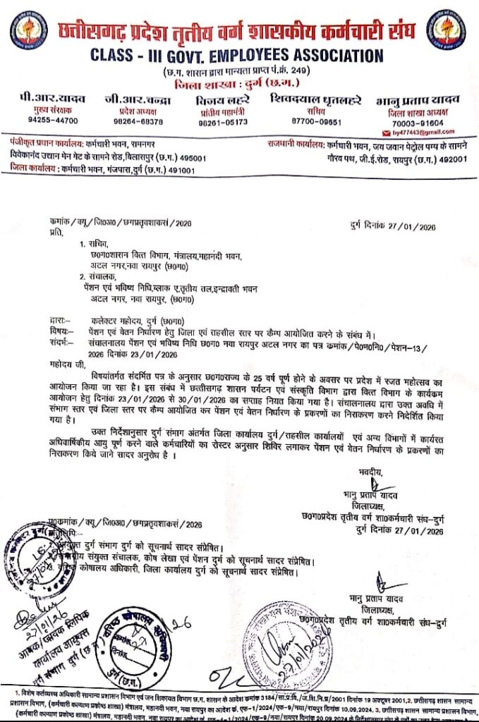 उक्त पत्र में संभाग एवं जिला स्तर पर कैम्प आयोजित कर पेंशन एवं वेतन निर्धारण के प्रकरणों का निराकरण करने के निर्देश दिए गए हैं।इन्हीं निर्देशों के अनुपालन में दुर्ग संभाग अंतर्गत जिला कार्यालय दुर्ग, तहसील कार्यालयों एवं अन्य विभागों में कार्यरत उन कर्मचारियों, जिन्होंने अधिवार्षिकीय आयु पूर्ण कर ली है, उनके पेंशन एवं वेतन निर्धारण के प्रकरणों के निराकरण हेतु रोस्टर अनुसार शिविर आयोजित करने की मांग की गई है।इस संबंध में छत्तीसगढ़ प्रदेश तृतीय वर्ग शासकीय कर्मचारी संघ, दुर्ग के जिलाध्यक्ष भानु प्रताप यादव द्वारा कलेक्टर महोदय दुर्ग के माध्यम से सचिव, छत्तीसगढ़ शासन वित्त विभाग रायपुर तथा संचालक, पेंशन एवं भविष्य निधि, ब्लॉक-ए, तृतीय तल, इन्द्रावती भवन, अटल नगर नवा रायपुर को ज्ञापन प्रेषित किया गया।