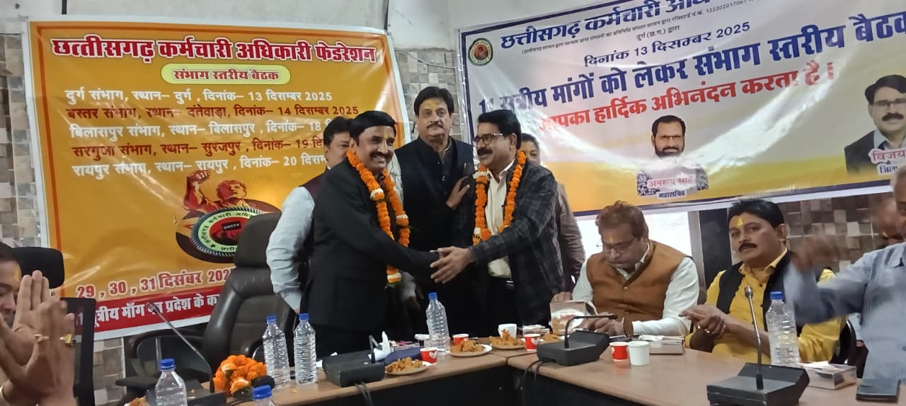 दुर्ग। छत्तीसगढ़ कर्मचारी अधिकारी फेडरेशन दुर्ग संभाग की संभागीय बैठक आज 13 दिसंबर 2025 को स्थानीय जनपद पंचायत सभाकक्ष में आयोजित की गई। बैठक की अध्यक्षता फेडरेशन के प्रांतीय संयोजक कमल वर्मा ने की।