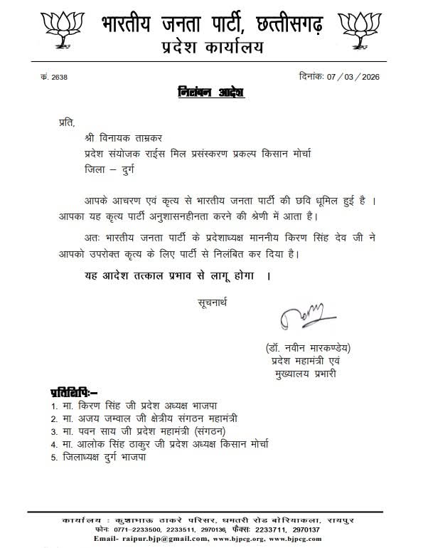 भाजपा छत्तीसगढ़ प्रदेश कार्यालय द्वारा जारी निलंबन आदेश (पत्र क्रमांक 2638) में प्रदेश अध्यक्ष किरण सिंह देव के निर्देश पर विनायक ताम्रकार को प्रदेश संयोजक, राइस मिल प्रसंस्करण प्रकोष्ठ, किसान मोर्चा पद से हटाते हुए तत्काल प्रभाव से पार्टी से निलंबित कर दिया गया है। आदेश में कहा गया है कि उनके आचरण से पार्टी की छवि धूमिल हुई है और यह अनुशासनहीनता की श्रेणी में आता है।इधर, इस मामले पर पूर्व मुख्यमंत्री भूपेश बघेल ने भाजपा सरकार पर तीखा हमला बोला है। उन्होंने कहा कि भाजपा एक तरफ नशे के खिलाफ बड़ी-बड़ी बातें करती है, लेकिन उनके ही नेता अफीम की खेती में शामिल पाए जा रहे हैं।