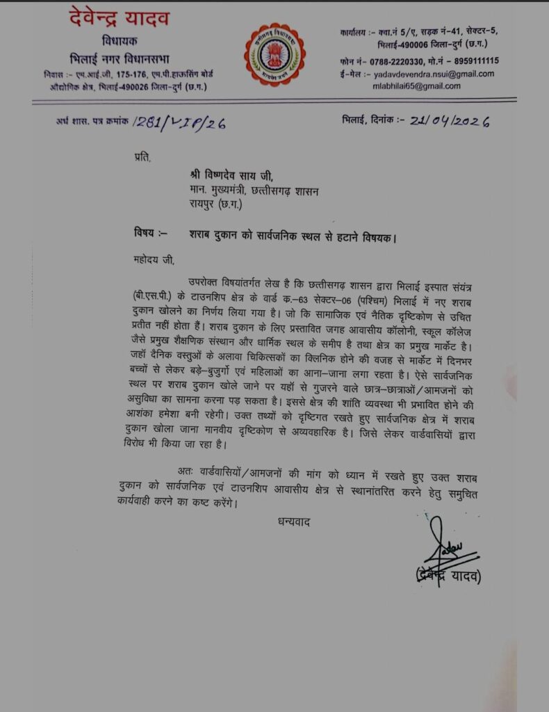 भिलाई। भिलाई इस्पात संयंत्र टाउनशिप के सेक्टर-6 (पश्चिम), वार्ड क्रमांक-63 में प्रस्तावित नई शराब दुकान का मामला अब तूल पकड़ता जा रहा है। स्थानीय निवासियों के विरोध के बीच, भिलाई नगर विधायक देवेंद्र यादव ने मुख्यमंत्री विष्णुदेव साय को पत्र लिखकर इस मामले में हस्तक्षेप की मांग की है।आवासीय और शैक्षणिक क्षेत्र की सुरक्षा पर सवालविधायक देवेंद्र यादव ने अपने पत्र में स्पष्ट किया है कि जिस स्थान पर शराब दुकान खोलने का निर्णय लिया गया है, वह सामाजिक और नैतिक दृष्टिकोण से पूरी तरह अनुचित है।