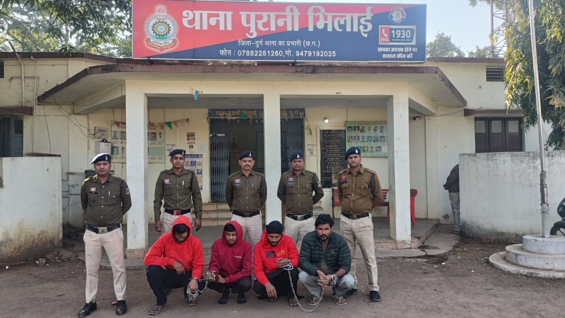 दिनांक 26 दिसंबर 2025 को थाना पुरानी भिलाई पुलिस को सूचना मिली कि सिरसा भाठा, मेंहदी बाड़ी के पास खाली मैदान में सफेद रंग की हुंडई वरना कार (क्रमांक CG-05-LW-6628), जिसका पिछला कांच टूटा हुआ है, में कुछ संदिग्ध व्यक्ति चिट्टा का सेवन कर रहे हैं। सूचना पर थाना पुरानी भिलाई पुलिस एवं एसीसीयू की संयुक्त टीम ने मौके पर पहुंचकर घेराबंदी की।कार में सवार व्यक्तियों ने अपने नाम रवेल सिंह उर्फ जॉनी (निवासी कैलाश नगर जामुल), दिशान्त (कार चालक, निवासी गनियारी), रोहित गुप्ता (निवासी संगम चौक, खुर्सीपार) एवं ओमकार सिंह उर्फ गोली सिंह (निवासी सुभाष मार्केट, खुर्सीपार) बताए।
