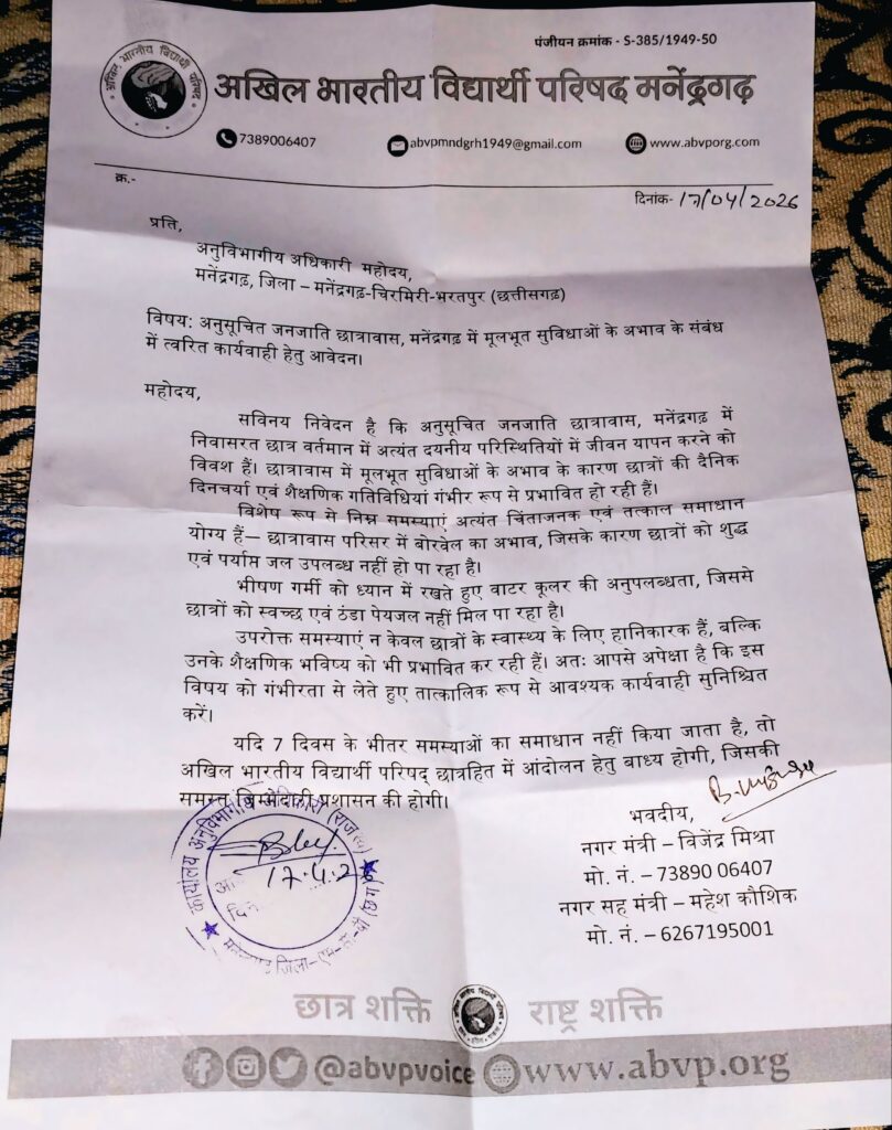 मनेन्द्रगढ़ छात्रावास में बदहाल व्यवस्था, 7 दिन का अल्टीमेट—अभाविप ने दी उग्र आंदोलन की चेतावनी