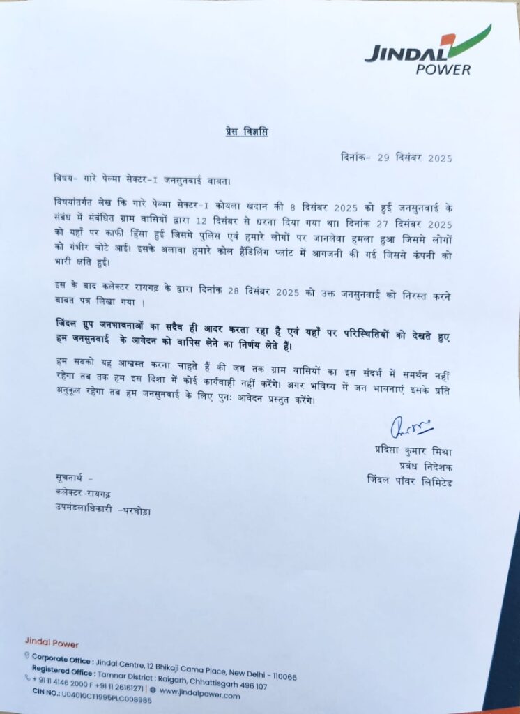 लगातार दबाव के बाद आखिरकार जन आंदोलन की जीत हुई। जिंदल कंपनी को अपनी हार स्वीकार करनी पड़ी और गारे पेलमा सेक्टर–1 को लेकर प्रस्तावित जनसुनवाई का आवेदन वापस ले लिया गया।