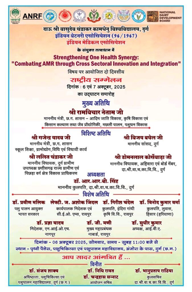 दुर्ग। दाऊ श्री वासुदेव चंद्राकर कामधेनु विश्वविद्यालय, दुर्ग में कुलपति डॉ. आर.आर. बी. सिंह की अध्यक्षता में “स्ट्रेंथनिंग वन हेल्थ सिनर्जीः कॉम्बेटिंग एंटीमाइक्रोबियल रेज़िस्टेंस (एएमआर) थ्रू क्रॉस सेक्टोरियल इनोवेशन एंड इंटीग्रेशन” विषय पर दो दिवसीय राष्ट्रीय सम्मेलन 6 और 7 अक्टूबर 2025 को आयोजित हो रहा है। यह आयोजन इंडियन वेटनरी एसोसिएशन एवं इंडियन मेडिकल एसोसिएशन के संयुक्त तत्वावधान में किया जा रहा है।
